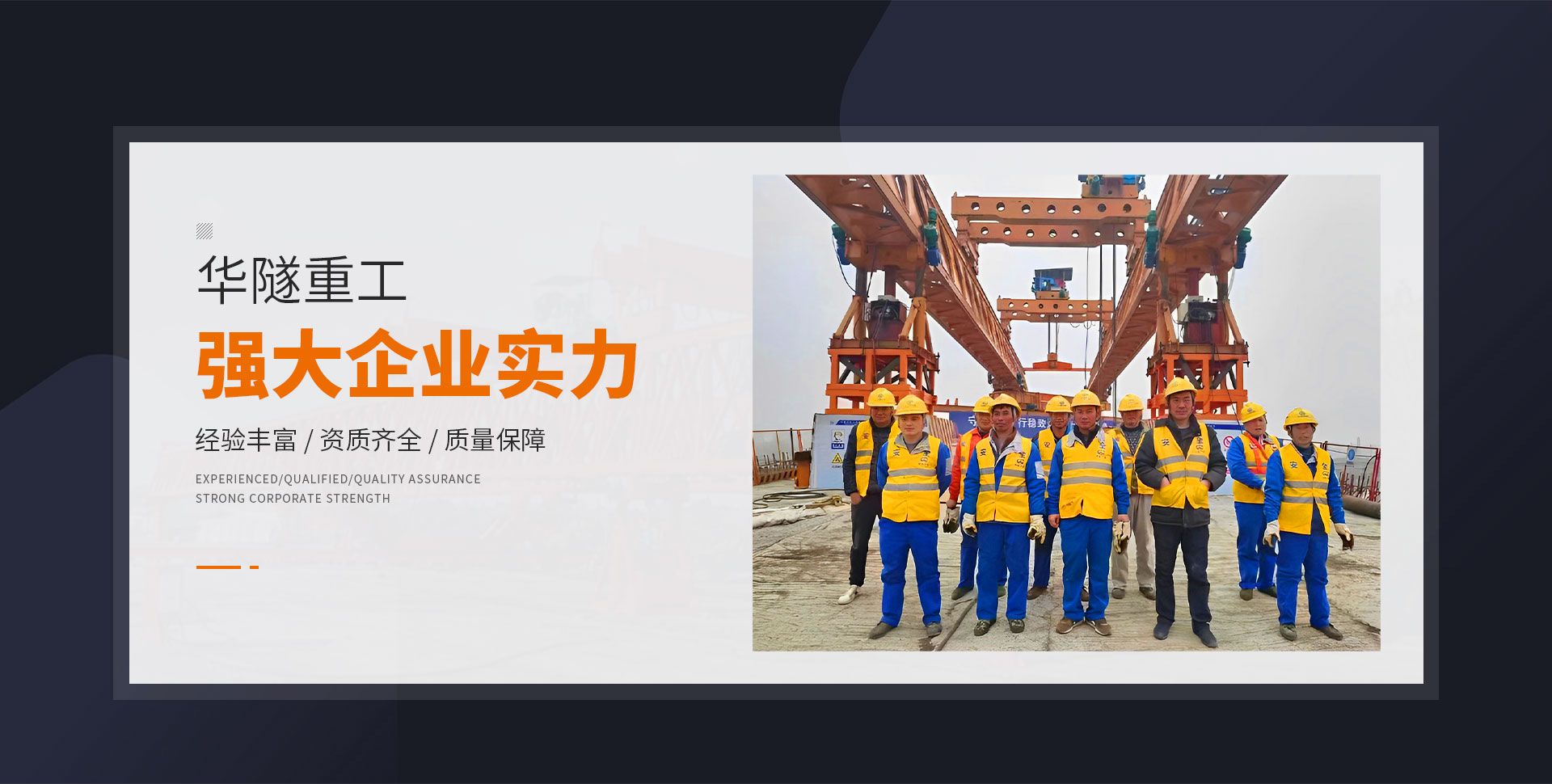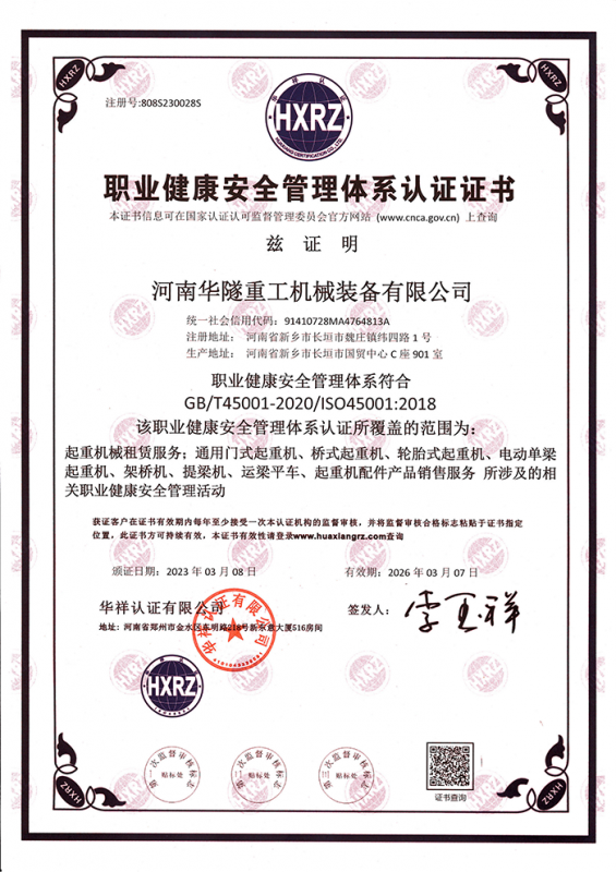 河南華隧重工機(jī)械裝備有限公司主要從事通用門式起重機(jī)、橋式起重機(jī)、電動(dòng)單梁起重機(jī),輪胎式起重機(jī)、架橋機(jī)、提梁機(jī)、遠(yuǎn)梁平車、鋼絲繩電動(dòng)萌蘆、卷?yè)P(yáng)機(jī)、起重配件制造、銷售:起重機(jī)械租賃、安裝和維修,起重設(shè)備園收,機(jī)械設(shè)備維修,鋼結(jié)構(gòu)工程承包,橋梁工程及技術(shù)咨淘服務(wù),銷售五金制品、機(jī)電設(shè)備:建設(shè)工程監(jiān)理,建設(shè)工程設(shè)計(jì),各類工程建設(shè)活動(dòng),建筑勞務(wù)分包,建筑物折除作業(yè),施工作業(yè),工程管理服務(wù),土石方工程施工,裝如發(fā)運(yùn)。  公司已通過IS0國(guó)際質(zhì)量、環(huán)境、健康與安全三合一標(biāo)準(zhǔn)認(rèn)證,特種設(shè)備制造許可證和特種設(shè)備安裝改造維修許可證。擁有完熟的質(zhì)量管理體系。嚴(yán)格的管理制度,強(qiáng)大的生產(chǎn)能力和先進(jìn)的檢測(cè)手段,在保證產(chǎn)品質(zhì)量的同時(shí),也具備了極強(qiáng)的市場(chǎng)競(jìng)爭(zhēng)力。  公司堅(jiān)持科技創(chuàng)新為理念,產(chǎn)品質(zhì)量為核心,注重信譽(yù),建立了減信可靠、快捷、思速。便利周到的售后服務(wù)網(wǎng)絡(luò)。  我們擁有的技術(shù)專家和技術(shù)服務(wù)隊(duì)伍為客戶提供充善的售前技術(shù)支持和全天候的售后服務(wù)體系,讓您無(wú)后顧之憂,享受一站式的超值服務(wù)。  “華隧重工,伴您成功“是華隧重工永遠(yuǎn)的宗指,真被的希望與各界朋友攜手并進(jìn)。共創(chuàng)輝準(zhǔn)!